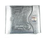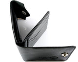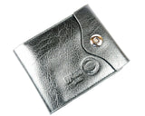Soft, genuine black leather wallet come in a tri-fold design. It features stud tab opening, two banknote pockets, extra full-length zip pocket to keep cash hidden or foreign currency separate, tab-fastening fold-out section with five card slots and three ID windows, coin section, plus three further pockets.